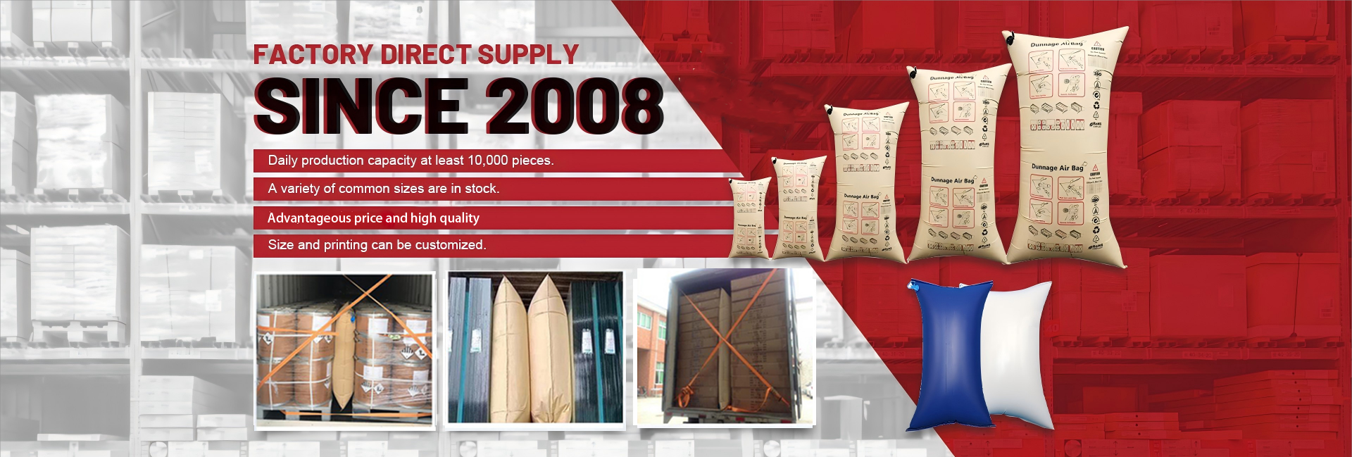 Productos principales:Bolsa de estiba, esquina de papel, correa de cordón, hoja deslizante, máquina de embalaje